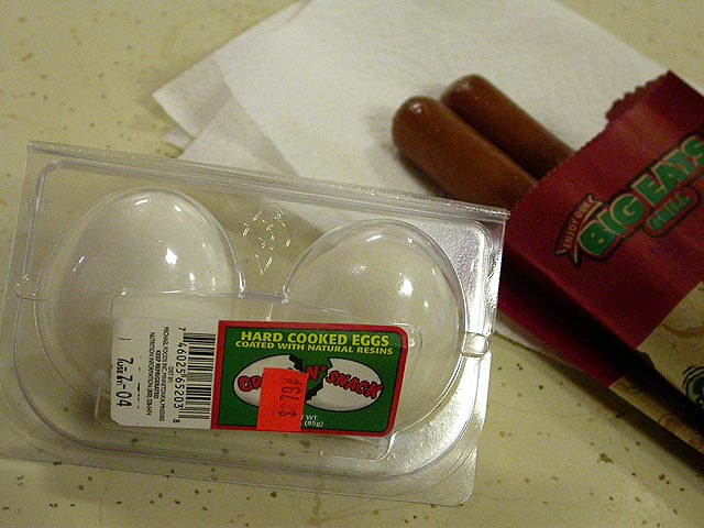 7-11 and got something to eat: i went with a large 40 oz. grape slurpee, alex had a pair of plain hot dogs and a package of hard boiled eggs. back at the office we both tried an egg "coated with natural resins" - other than the fact that it tasted a bit rubbery, it was okay. after work i went over to julie's place, where we went to
