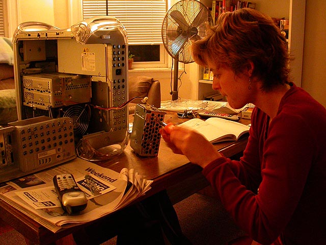 microcenter to do some shopping. she had a spending spree and got a 160gb internal hard drive as well as a new firewire card replaced the broken one on her G4 motherboard. we went back to her place, where within the time it took for our