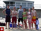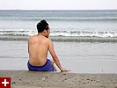 it was absolutely freezing, the water temperature must've been 40 degrees or something. it was just a case of extreme temperatures happening simultaneously. while my upper body was jungle hot, everything below my knees was subzero. after a while though, i sort of got used to it, and it didn't feel so bad, even if my toes were a little bit numb. later i'd discover a new trick, where i'd sit just at the edge of where the beach ended and the surf begin, and while sitting on the beach warmed me up, whenever the surf came in it'd cool me off, so there was always this happy balance. it took some getting used to, as cold surf water hitting my privates felt like that weird sensation you get right after somebody hits you in the balls, before the pain kicks in, kind of like a muted "that's not right" feeling. experience it yourself my friends! later, julie's parents played bocchi ball while julie and i threw around a plastic wiffle ball with jai alai sticks. i was all diving and getting dirty in the sand catching the ball while julie pretty much stayed a stationary target.