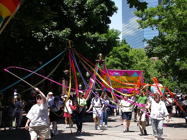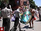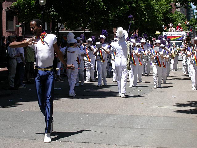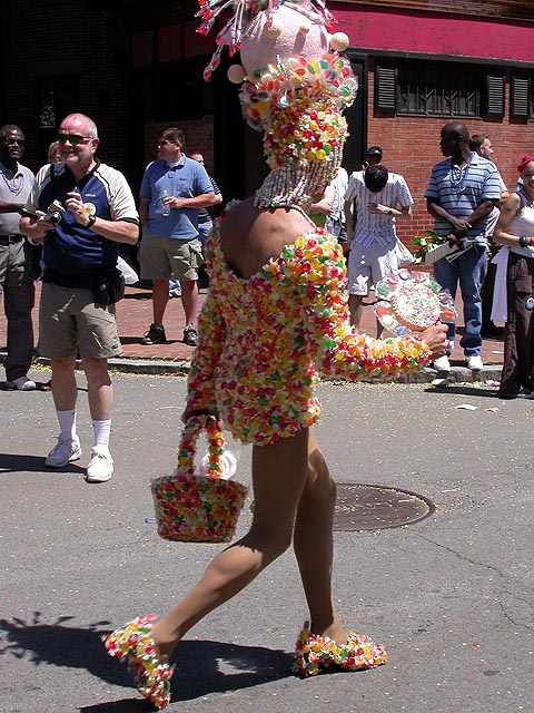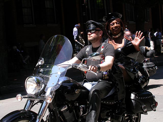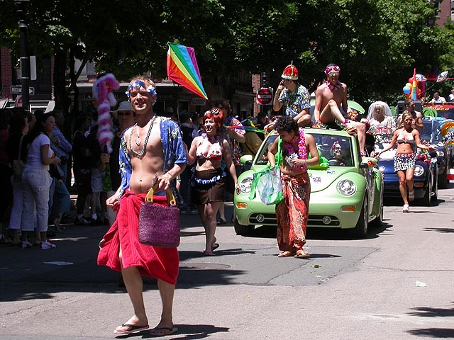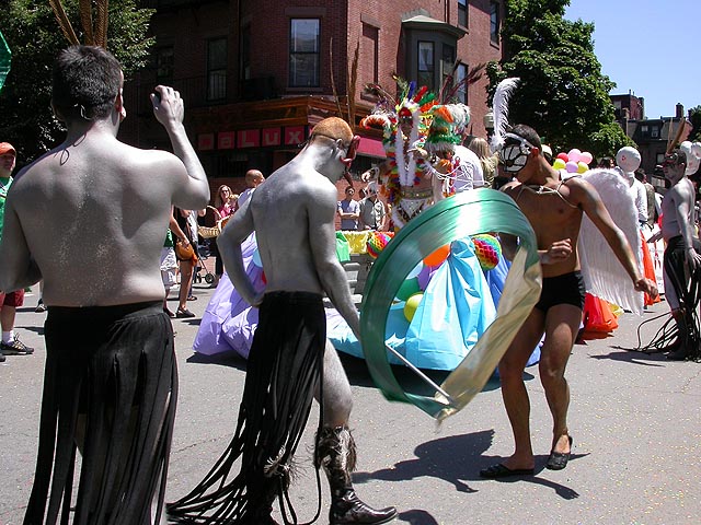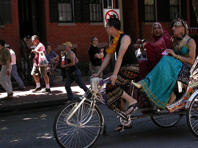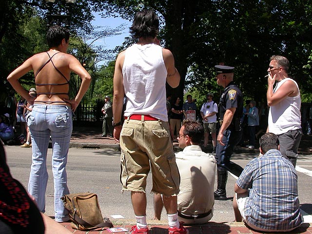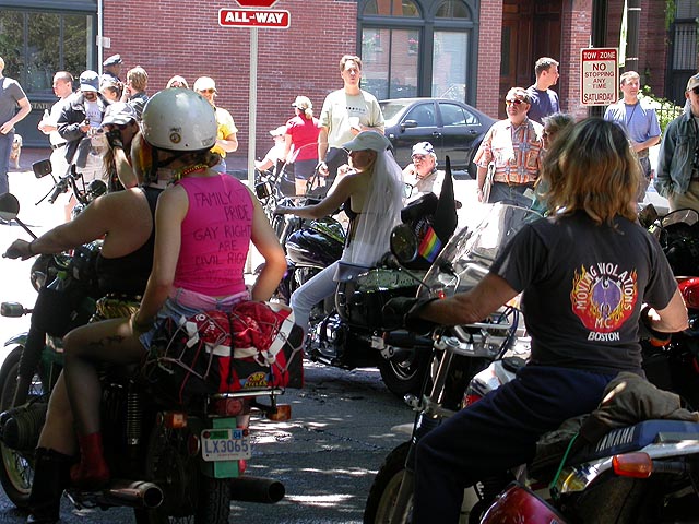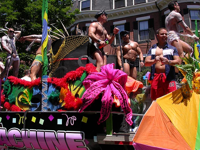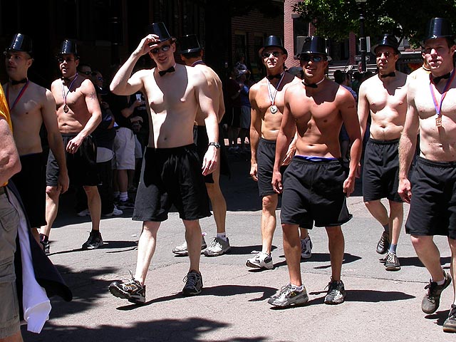the pride parade is definitely the most interesting in terms of eye candy. unlike last year, i wouldn't be wearing a tuxedo again, but i had on my "chinese food" t-shirt, hoping to garner some special attention nevertheless. ed led us into the heart of the south end, near the beginning of the parade route. we waited underneath the shade of a tree for the parade to start. the first to arrive were the bikers, the women followed by the men. next came mayor menino and his entourage. the following is an abbreviated sampling of the festivities: