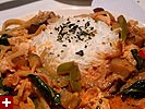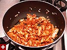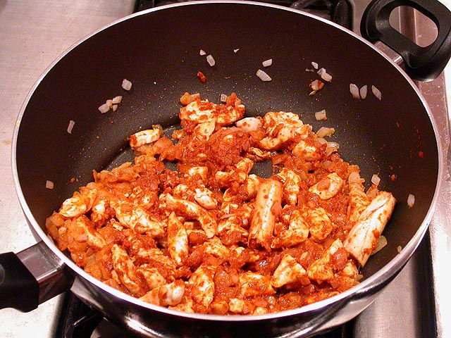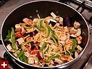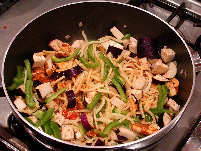 likewise with the peanut oil, any kind of cooking oil is fine. after about 30 seconds, you throw in the chicken until that's cooked. you can also substitute for the chicken. i've tried beef (only once though, i didn't like it as much), and for your vegetarian friends, tofu works well too.