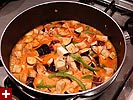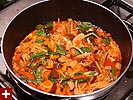 it's kind of scary because you're thinking, "hmmm, is this right?" but once the coconut milk hits the pan, there can be no doubt that everything will be perfect, the fragrance is mouthwatering. once everything comes back up to a boil, turn the heat down (medium) and put the cover on the pan, letting it simmer for 15 minutes. it's a good time to explain some of various ingredients while we're waiting. i'm not a big fan of eggplants, but they're important in this recipe because it'll absorb a lot of the flavor like a sponge.