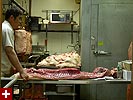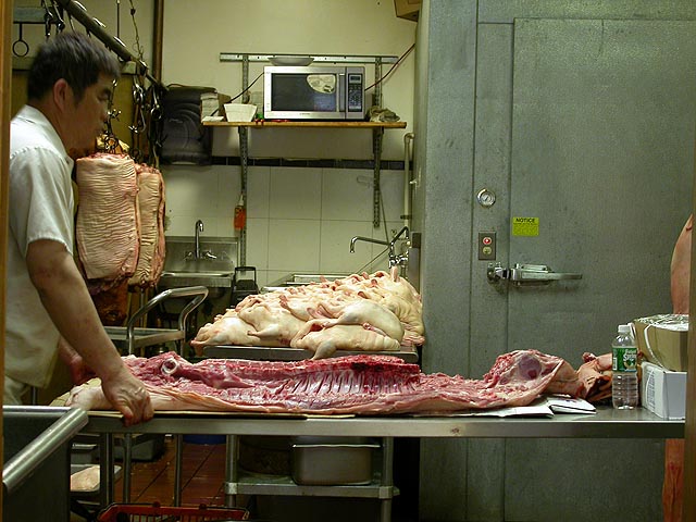 but here in boston (and much of the east coast), the dialect is cantonese, which i can't speak (i know only mandarin). a few of the more aggressive patrons cut us in line since we didn't know what was going on. the door to the slaughter room was opened and james and i watched as one of the butchers spread out a whole pig carcass on a tabletop to be divided. two bins of pig entrails were pushed out and a pair of old chinese women were quick to scavenge the parts into plastic bags, their mixed booty containing pig's feet and perhaps intestines.