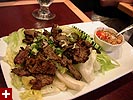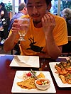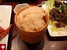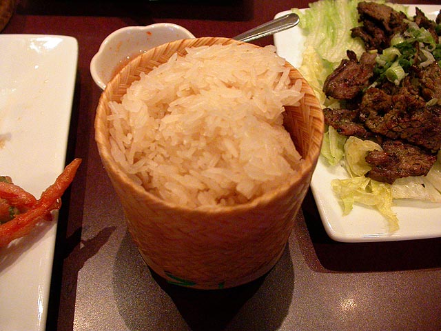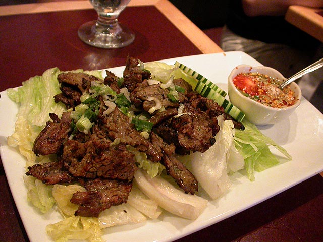 by itself perhaps not as interesting as with the fish sauce. however, the morning glory was quite excellent, and immediately i thought about all the people i was going to tell to come to this restaurant to try this dish, it's that good. our main entree was a shared "excited tiger" (i think that was the name, definitely had tiger in it though), barbecued beef on a bed of lettuce with a sauce that's a medley of different hot peppers yet at the same time not overwhelming. once again, mouthwateringly delicious. renata showed me how people in southeastern asia eat the sticky rice with their hands (i thought it was a primative custom, but i'm just a cultural bigot).