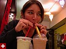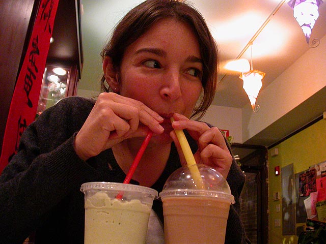 when she learned that we would be having our drinks for here, the counter girl asked us to sit down so she could serve us. the place wasn't all about tea either, they also served lunch food which could subsitute for a light dinner. renata had a non-diary green tea shake while i went with the standard bubble ice tea. renata noticed how one side of the wall seemed chinese, with various teapots on shelves, while another side seemed more vietnamese, with southeast asian artworks hanging on the wall. i found the tapioca balls in the bubble ice tea to be on the hard side. the proper consistency is like gum, firm yet soft. i still think the best place to get a good bubble ice tea (if not my parents' place) is that chinese bookstore by where i work in chinatown.