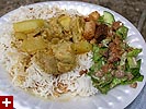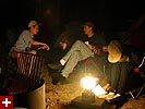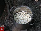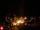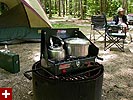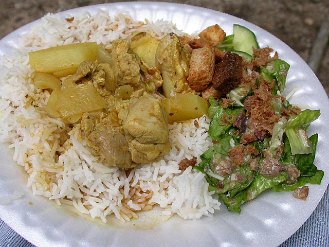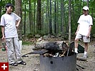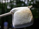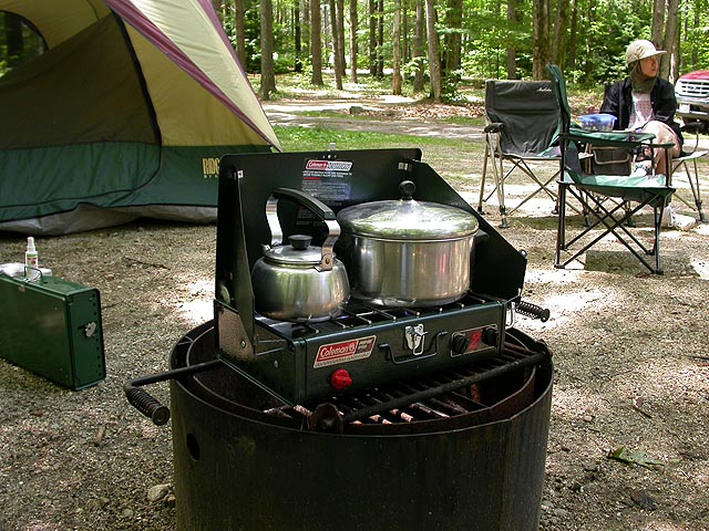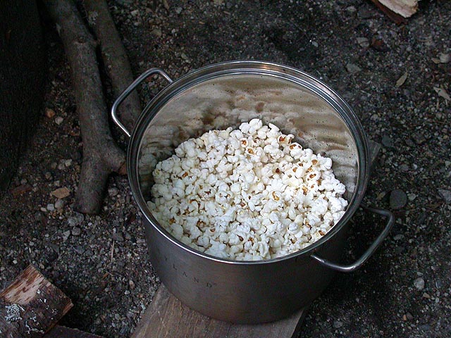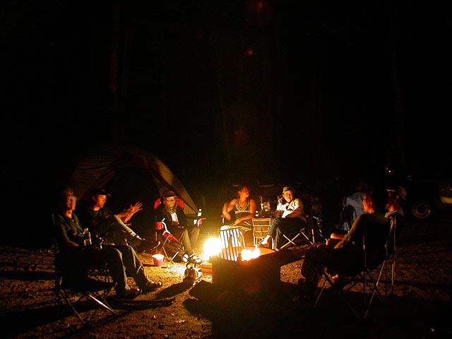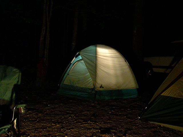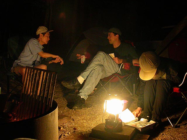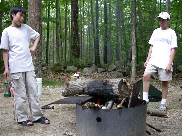when we came back to our campsites, fansusu and his family arrived soon afterwards. it wasn't long before we were cooking dinner. my mother made curry chicken for everyone. i would've preferred some sort of barbecue, but we didn't realize there was a grill at the camp (otherwise we would've brought some meat). it was probably around 6pm, the sky not yet dark, that we decided to start the campfire. we didn't have any good firewood except for the free scraps the rangers would put outside his office periodically. we used a lot of rolled up newspapers, dry twigs, and wet tree branches that we cut with a pruning saw that my father just happened to have in the car. the fire that we eventually had was not very large. when it got dark, we could see the fires of other campsites, roaring bonfires as tall as a man, compared to ours, which was always in danger of dying out and had to be stoked continously in order to keep it alive. we also toasted some marshmellows, as well as popping some popcorn in a pot.