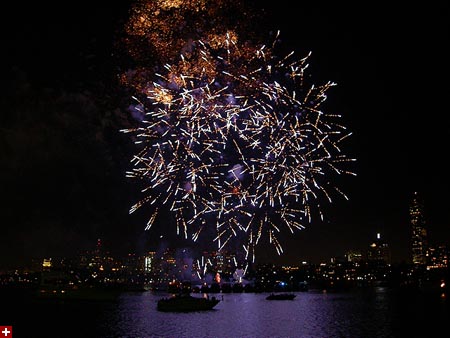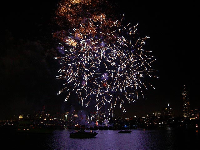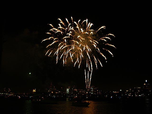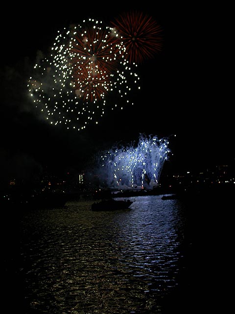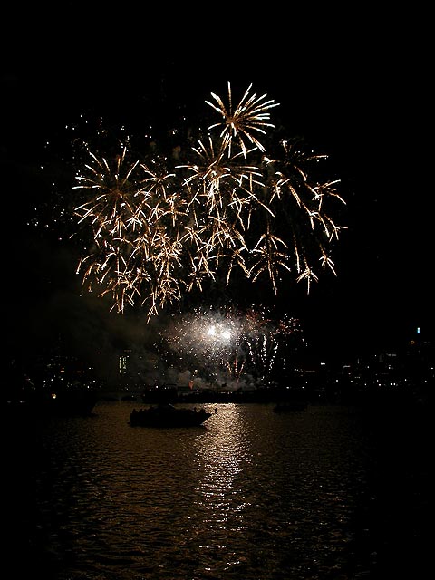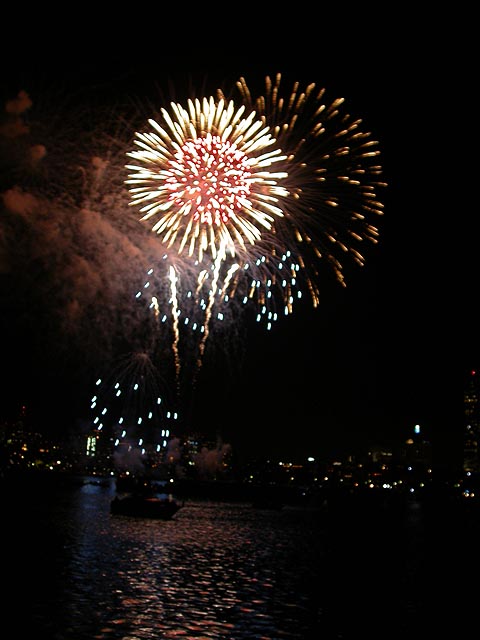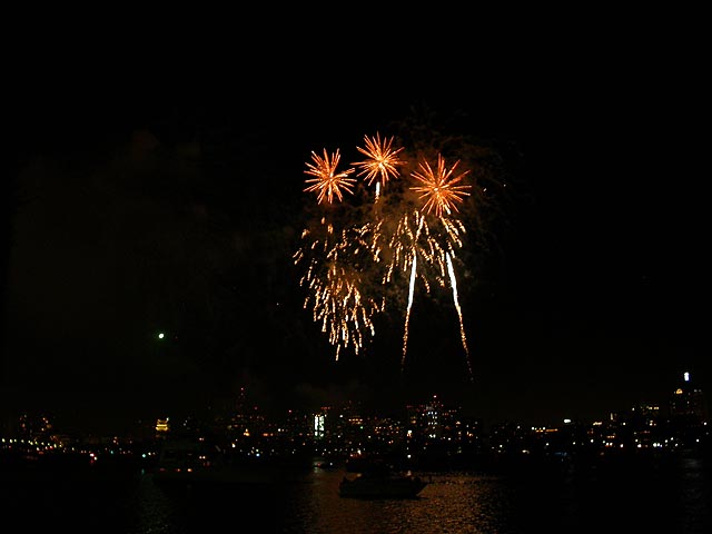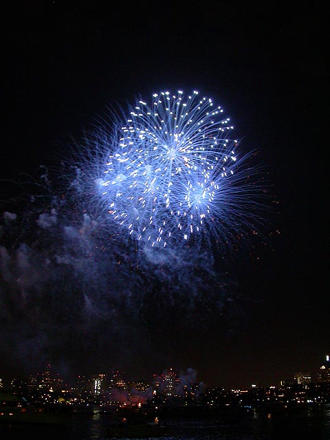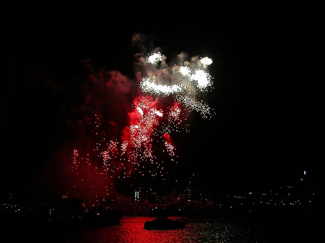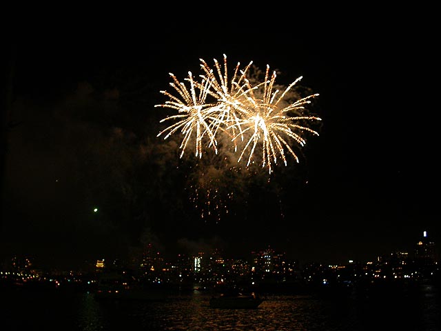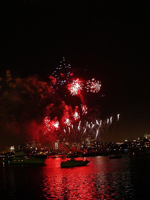 we forgot all about being drowsy and watched the pyrotechnic spectacle. renata liked them big and showy, i prefer the gimmicky fireworks like the ones that form into a star or the shape of a heart. we were so close that some of my photos were overexposed from the brightness. across the river, the prudential building reflected back all the myraid of colors like a vertical mirror. sometimes when the smoke mixes with the bright flares and lit up in different colors, it reminds me of those photos of space nebulas.