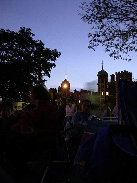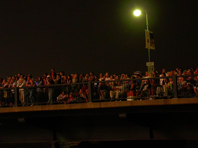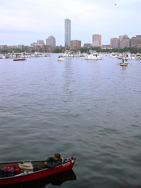 we found a great spot on the corner of mass avenue and memorial drive, sitting on the sidewalk, pressed up against the metal fence lining the edge of the charles river. we were surrounded by spreads of blankets and lawn chairs, people having staked out their claim of territory before we arrived. somebody had a radio turned to WBZ's broadcast of the celebration on the esplanade so everyone could hear what was going on.