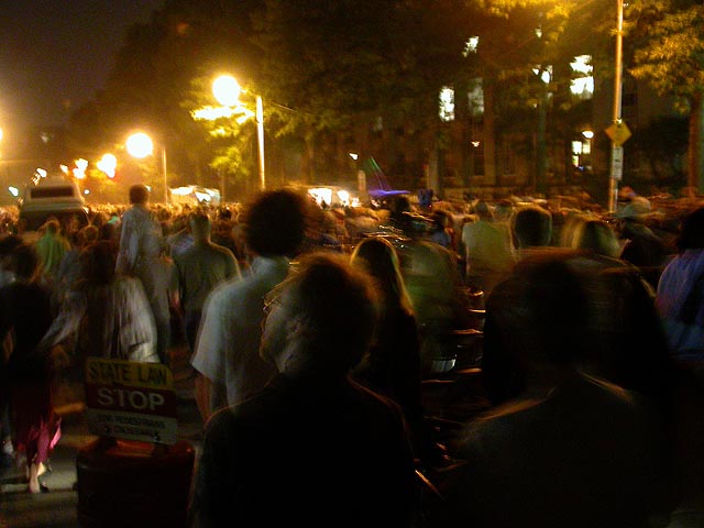when the show was over, there was a mass exodus into the street. renata and i pressed ourselves into the crowd and just went with the flow, eventually making it out to mass ave, where we visited the student center for the final time, using its facilities. on the radio a police gave an estimate of about half a million people in attendance tonight. i had that number in mind when i went to go use the bathroom, so i was surprised when it was virtually empty. it was only when we left the building did we see the swarm of bathroom seekers attacking the place.
