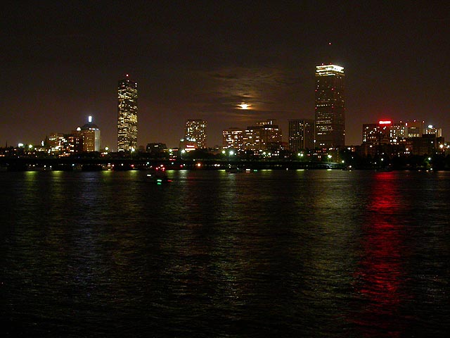or perhaps the silhouette of a couple sitting by the riverbanks. MIT students, intoxicated, ingenius, pumped music out onto memorial drive from ridiculously loud speakers. others were walking away from boston like us, passing us as we slowly trudged along with our 30something legs. when we got to jfk street by harvard square, in the darkness of the night a woman on a bicycle and a man rollerblading quickly sped past us. i had a flash of recognition, looked back and shouted, "eliza jones!" i couldn't be sure, but worth a try. "yeah!" she answered, turning the bike around, not fully realizing who it was quite yet. it was eliza and david, on their way home from watching fahrenheit 9/11 in harvard square. we exchanged some pleasantries then went on our merry way.