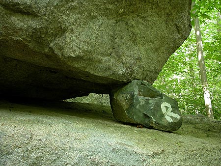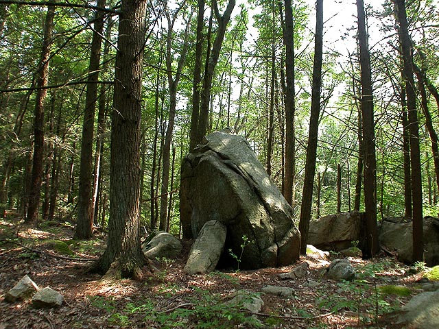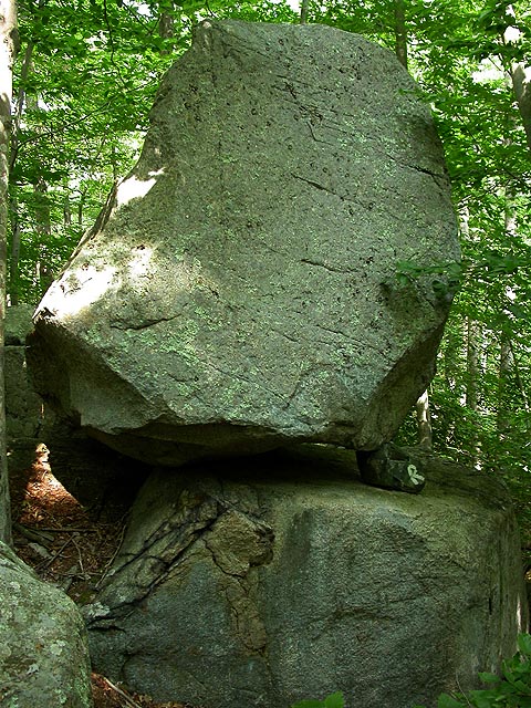 actually in this area (eastern half of the reservation) are many such large boulders, either strangely shaped or positioned in an awkward way. like back in milliken's memorial path, there's a large stone disc that looks like a crude sundial, held upright by another boulder.