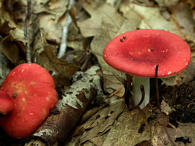 while other were red. the red ones were definitely the most common mushrooms i saw in the forest. at first i thought they were kind of cool, but when i started to see them everywhere, i quickly became jaded. they might've been emetic russulas, which are poisonous. i'd rather see some amanitas, which have the stereotypical mushroom look (with a skirts and flecks of white on the cap), and which are also deadly.