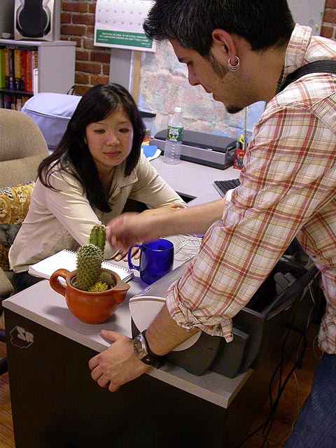 and was telling us how it used to be shaped like a duck. such fine handcraftsmanship deserves heirloom status so i was surprised when she wanted to throw it away, then thought it'd be more fun to stomp on it with her feet. there was also a 7 year old pot of cacti that belongs to her, and she told us how even though she never waters them, they still seem to be surviving after all these years.