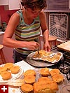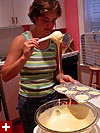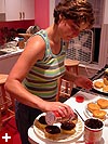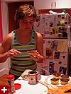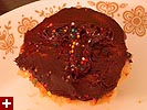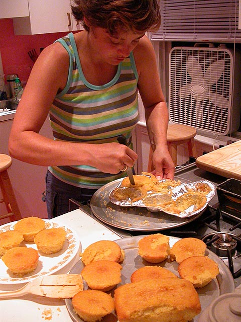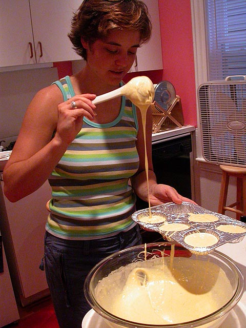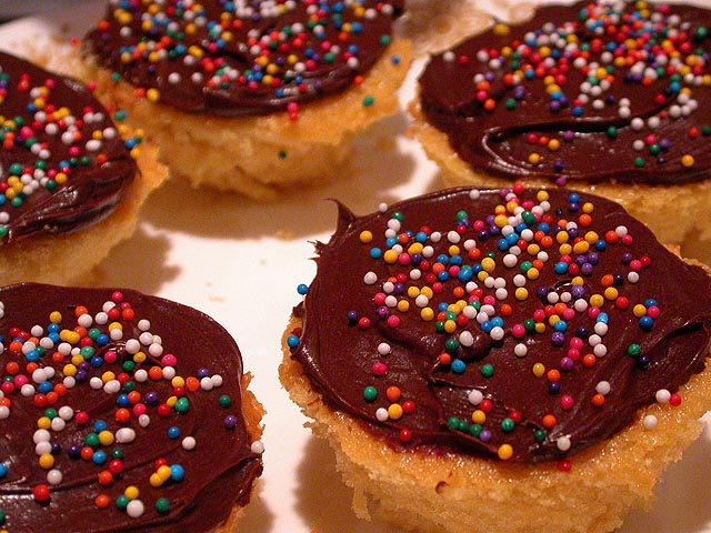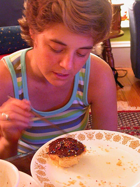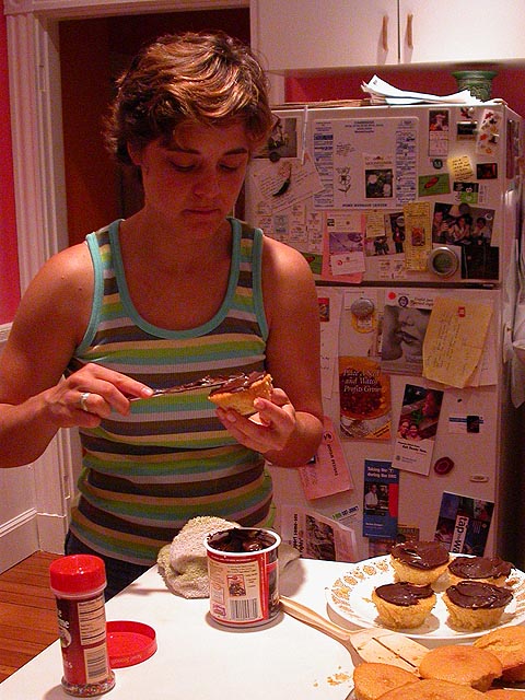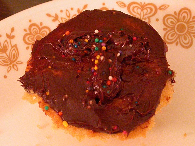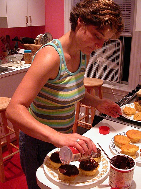 filled the aluminum cupcake tins, threw them into the oven, baked, and viola! cupcakes! i had the tins on pizza trays (because i was afraid the cupcakes would overflow, which it never did), so they didn't bake evenly until julie opened up the oven and discovered too late what i did. we baked them 10 more minutes (minus trays), but the muffins were flat after that. julie frosted them with chocolate spread, then poured on the rainbow sprinkles, which is how this evening all started in the first place, when she confessed to me over instant message that she'd been eating the sprinkles like candy all day.