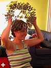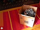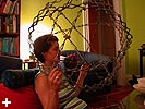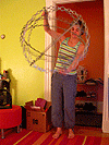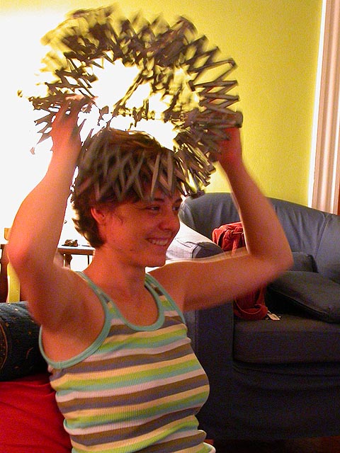 segments that can be opened and expanded to many times its original size: from 9" diameter to 30" across. i'd discovered that when expanded, it's actually big enough for me to wear as a fat suit. what julie and i found out tonight was if you drop the sphere while it's expanded out to its maximize size, it will bounce then instantly shrink back to its normal size. we also had a blast wearing it on our head like a helmet or maybe a hat or afro.