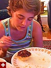we each had 3 cupcakes after dinner for dessert. julie worked on a 4th one, scraping off bits of chocolate frosty until it formed the letter "T" in bas-relief. i get a kick watching people being creative, even if it is just playing with their food. i think she just wanted to eat the frosting though. maybe the "T" was to entice me to help her eat the rest of that cupcake. later the cupcake disappeared, don't know if she had it or threw it away.