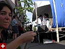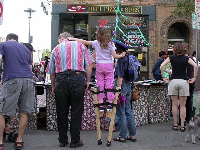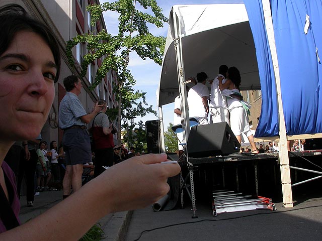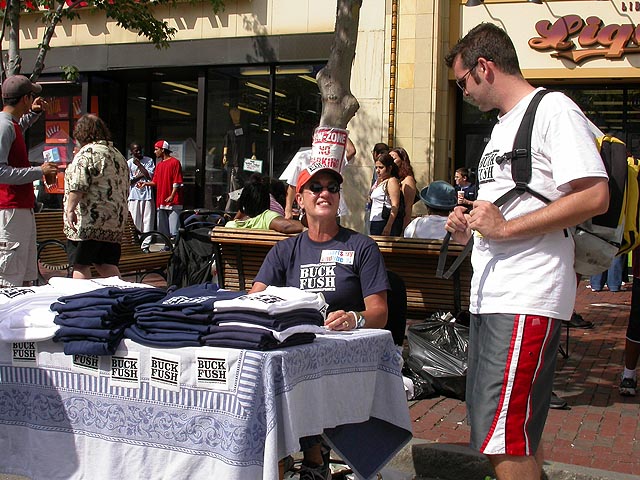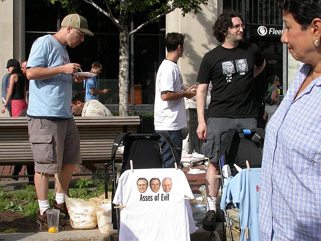 the july world's fair in central square is very much like the river fest that happens here during june. all of central square is closed down as the streets and sidewalks become congested with people walking around and vendors selling jewelry, clothing, artworks, and food. with the DNC in town and being how it's an election year, there was a plethora of political merchandise, from t-shirts to books, all of them with a liberal slant and a lot of bush hate (which i think is a bad thing, when you're so wrapped up in extremism, you fail to see the faults within your own group, in this case the democrats, who are no saviours themselves). we walked from one end to the other, then turned back to get some food. we picked a tibetan stand called rangzen, got a styrofoam box full of food for $5. we went down a side street and camped behind a performance stage where people were doing interpretive dancing. we ate sitting on the curb, before noticing that right across from us was the rangzen restaurant.