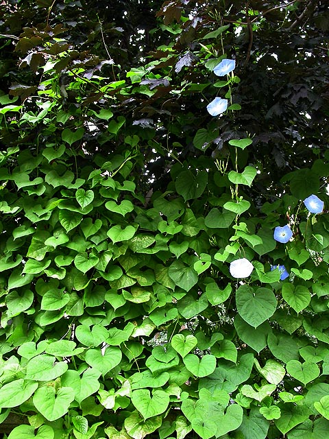 on forest street i saw a massive trellis of morning glories. "he does this every year," a man suddenly appeared from behind a bush, "they go all the way up to the roof." next to the morning glories was a beautiful front lawn vegetable garden. coming back, i bumped into my neighbor renee, who locked me in a long street conversation. a pretty neighbor with exposed midriff briefly distracted me as she walked by us with her dog. during the conversation i found out renee was actually demonstrating in the free speech zone monday morning and that a young matt damon used to be a tenant in her condo.