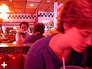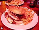 after the movie, we drove around in search of late night eats. julie had a list of spots she found online, restaurants that advertised late hours. you have to understand that most restaurants here in greater boston close at 10pm, so late hours might just mean 11pm. we finally ended up in harvard square, where after looking at a few places (penang, border cafe), we decided to go with charlie's kitchen (opened to at least 1:30am). you know it's a special place when futurama is playing on the flat screen television and somebody orders up a new order song on the jukebox.