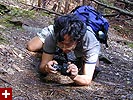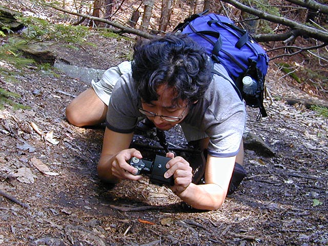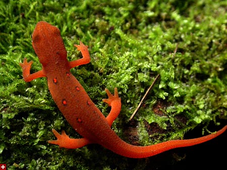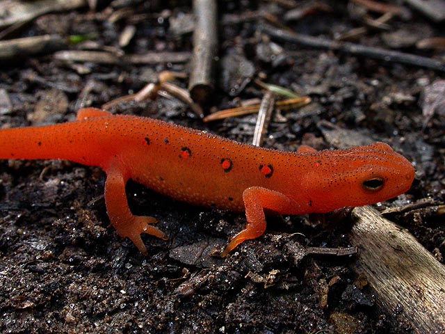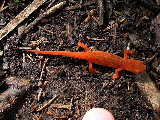 on the trail coming back down was when i spotted the eft. it was just standing there in the middle of the path, like a plastic toy, completely motionless. it didn't seem real, like this was a dream. i've been searching all spring and all summer, and now here in the woods of vermont, i've finally come face to face with the red eft! i shouted at my parents,