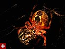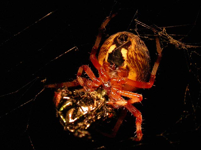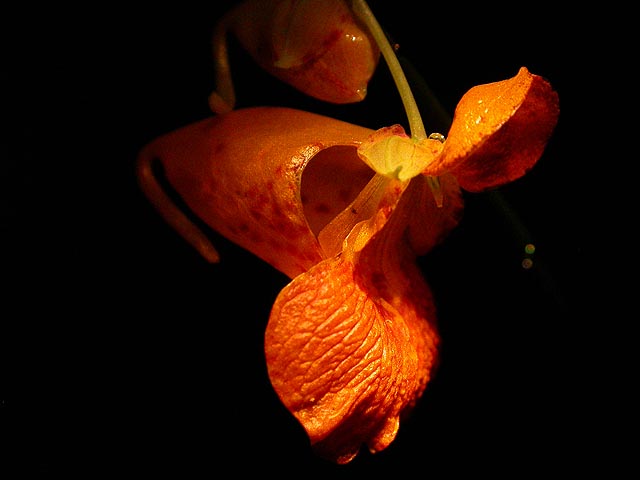 when i came back i wore my headlamp and went around our campsite looking for some night time photo opportunities. the great thing about taking photos at night is the lack of distracting backgrounds. it's usually just the subject in front of nothing but blackness. i saw a marbled orb weaver spider busy wrapping her latest catch, a japanese beetle. jewelweed leaves, because of their shape, had droplets of condensation around their edges. i'd love to do more night photography, and the headlamp in combination with the swivel design of my camera really helps, as i can take a photo from below while lighting it up from the top.
