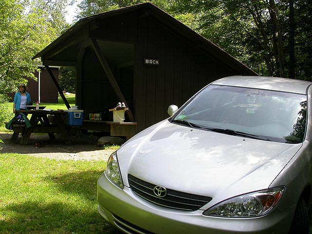 the one that crosses the conneticut river, to take some photos. speedboats, jetskis, and canoes could be seen down below. we drove by the infamous bar-b-que bar, a pitstop i once made with some squid folks one night enroute to vermont, where we called it the "bar-b-one" because we couldn't read the sign clearly. my parents had picked the molly stark state park in wilmington (southern vermont) for our campsite. compared to the bradbury mountain state park in maine that i went to last month, this was a much better setup. clean bathrooms with flush toilets and free hot showers.