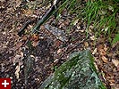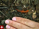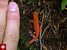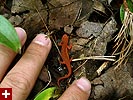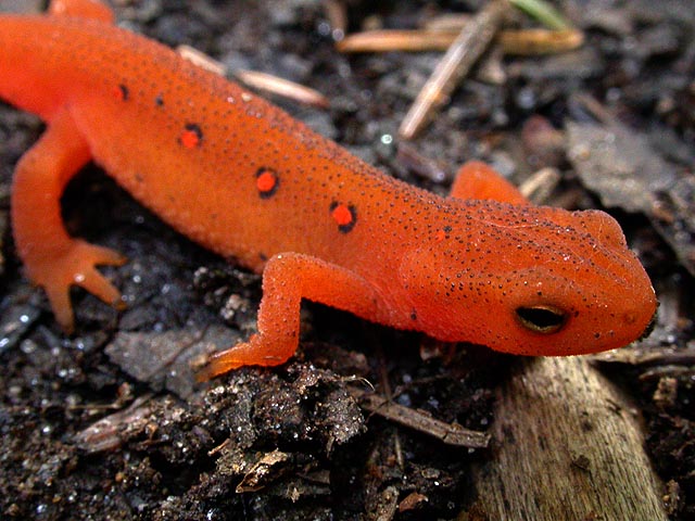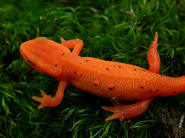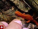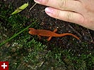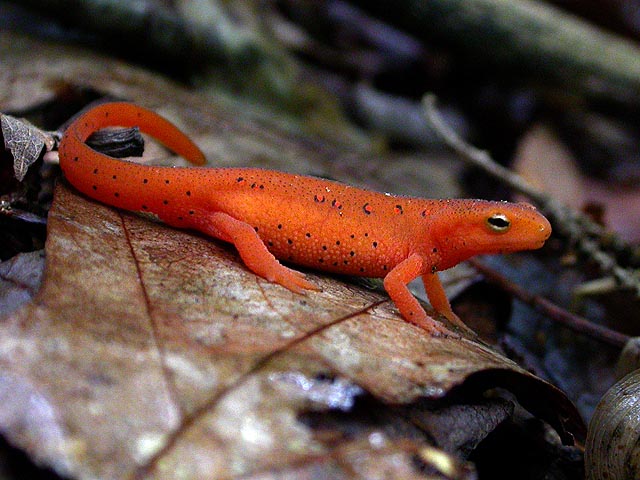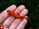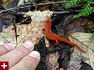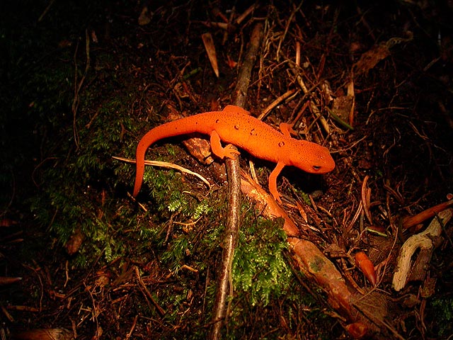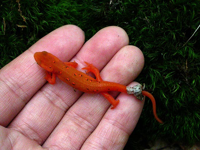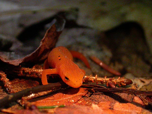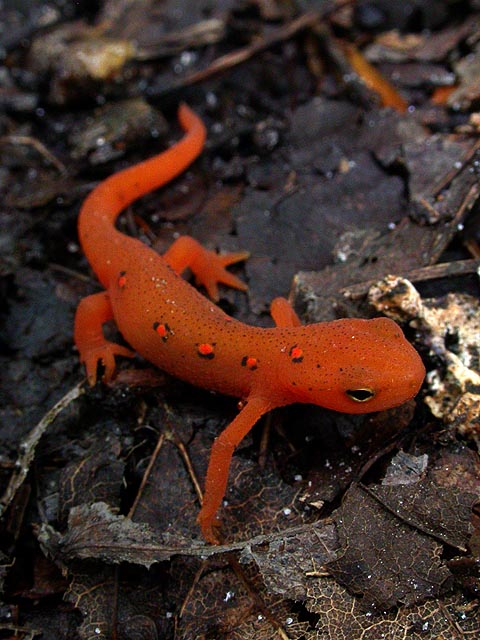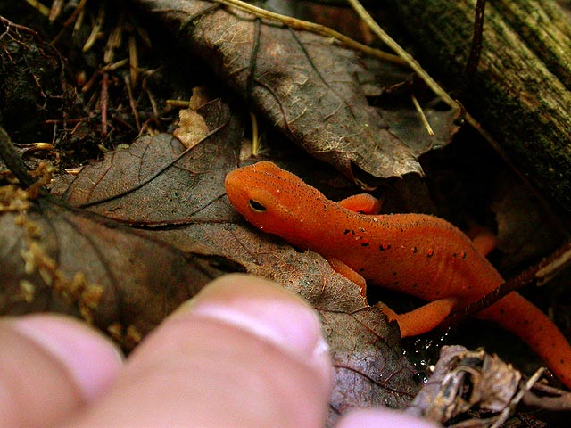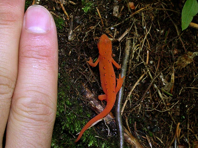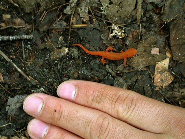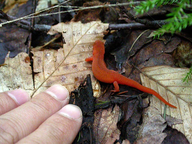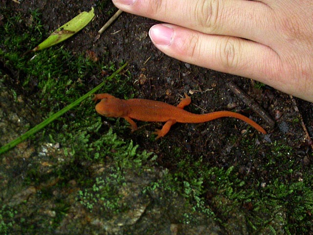 eft 3 was this tiny little thing that i saw standing behind a rock on the trail, and one of the only two i saw actually on the trail (all the other ones were found off on the side). while searching for some moss to spice things up, i can across a big eft on top of some leaf debris. i quickly forgot about eft 3 and focused on eft 4. it seemed to be caught on something, a loop of some kind was constricting its hind legs.