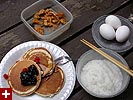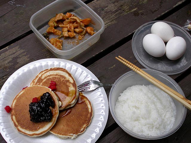 i finally made it out of the forest by 10:20. my parents were getting worried and almost had to go searching for me (we had to check out of the campsite by 11). i was starving, and wolfed down breakfast of rice porridge and pancakes (searched with natural maple syrup,