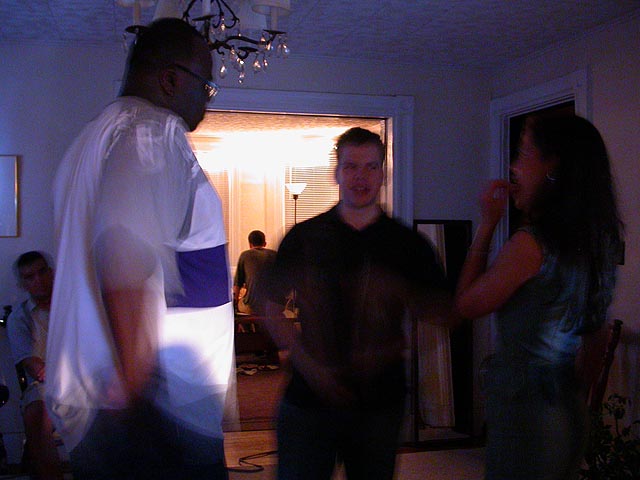 i found julie in the kitchen talking with two guys. when i tried to get her attention she seemed oblivious to my presence, so i fixed myself a drink (cranberry juice) and went out to sit on the steps (away from the heat inside the house) with my new friends deb and nicole and a guy.