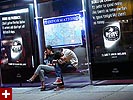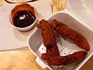 i went out with a bunch of office folks to the marriott hotel food court. there was nothing there i really wanted to eat, and all i could think about was steak tips sandwiches, but i settled for a serving of chicken fingers, three fried strips for $4 served with a barbecue sauce that i dropped on our way back to the office.