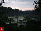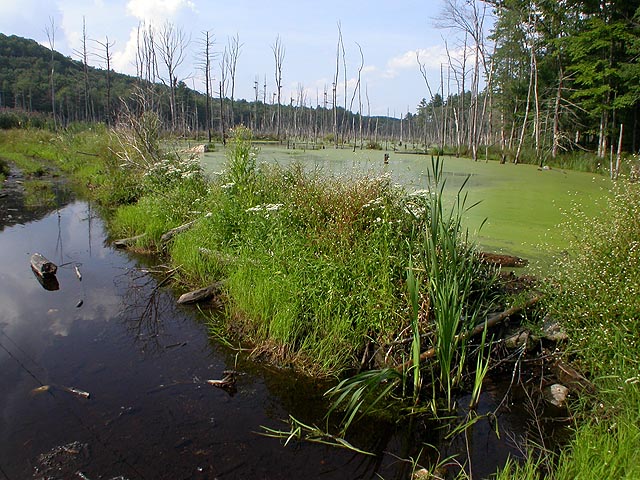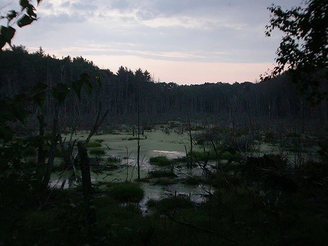 we did the mill pond loop (1 mile) and parts of the north trail (2 miles), taking in two scenic vistas (one of them being carpenter's rock, with a mountain view of the camp-exclusive walker pond beach), a beaver inhabited pond, and several "wetlands." i don't know what those places are called, those areas flooded with water, covered in this opaque green film, dotted with dead trees. maybe they're just flooded lowland forest areas and don't really have an official name.