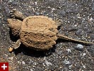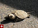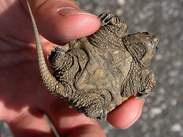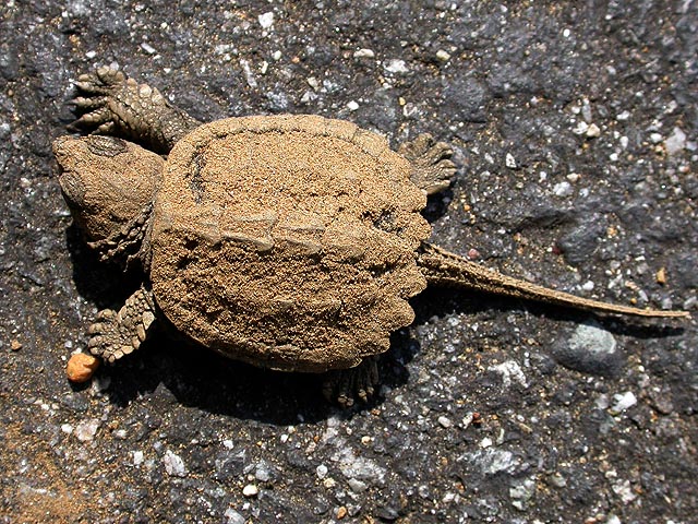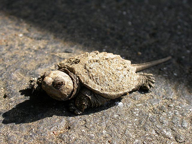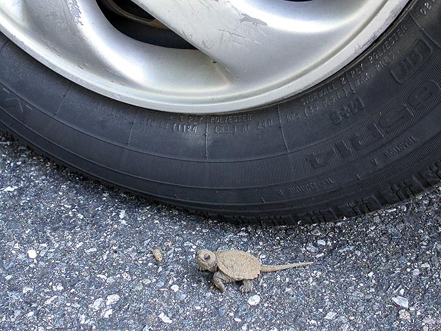 i immediately recognized them as snapping turtles (jagged edged shell, long tail), and was at the same time attracted to these baby turtles as i was repulsed by what they'll eventually become as adults. the ones on the parking lot were crawling into the shade of the cars to escape the hot sun, while the ones closer towards the woods were trying to find shade underneath the trees. mill pond was nearby, and that's probably where they're heading. so fresh were these turtles that they were still covered in dirt, having just crawled out of the ground.