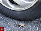 where earlier it was covered in baby turtles. the park volunteers had already been by in their golf cart and picked up most of the turtles so they wouldn't get runned out. i figured maybe they were painted turtles, and thought there wouldn't be anymore, while my father looked under a few cars, until he saw one, and them we saw a few more.