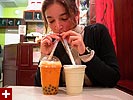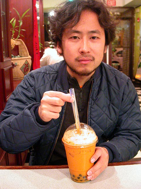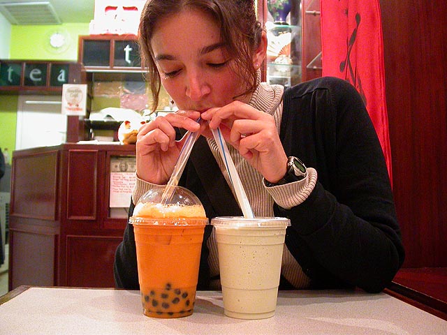 we ate some guava. then we went out for a walk, destination cvs, where renata had to buy a watch battery for her travel alarm clock so she can wake up tomorrow morning for work even though the whole evening she was moaning and groaning about how she didn't want to go back. we stopped off at the bubble ice tea cafe to get some drinks, renata went with the green tea slushie, treating me to some thai ice tea with tapioca balls.