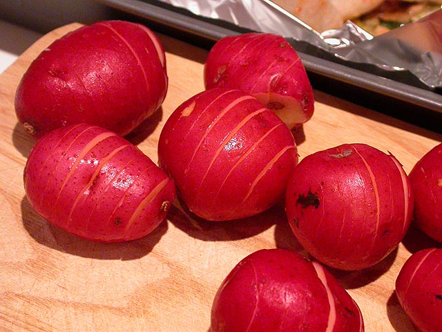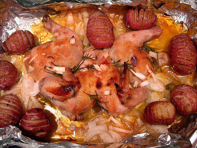 i went to the SRM office today and worked a full 8 hours. there was a group takeout order and i got some maki sushi for lunch. i went a little too heavy with the wasabi and did all i could from screaming with every bite. when i came back home, there was the weber grill waiting for me in the backyard, along with a bag of brickets, courtesy of my father. the cat, left at home the entire day, was eager to go outside, and started wheezing from all the excitement. later in the evening, while rob heated up a chicken pot pie he'd bought from star market, i cooked up my rosemary lemon chicken with hasselback potatoes. we watched some civil war documentary, some world series of poker, and