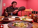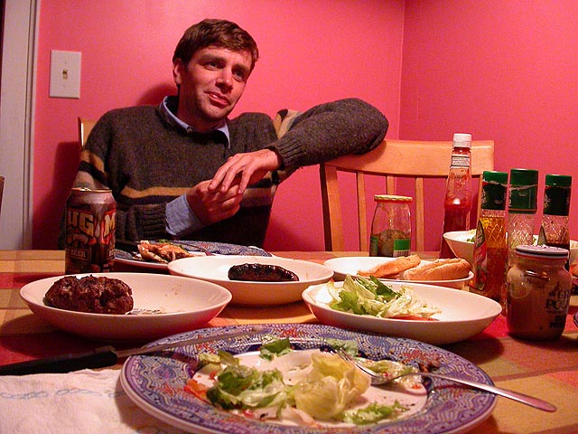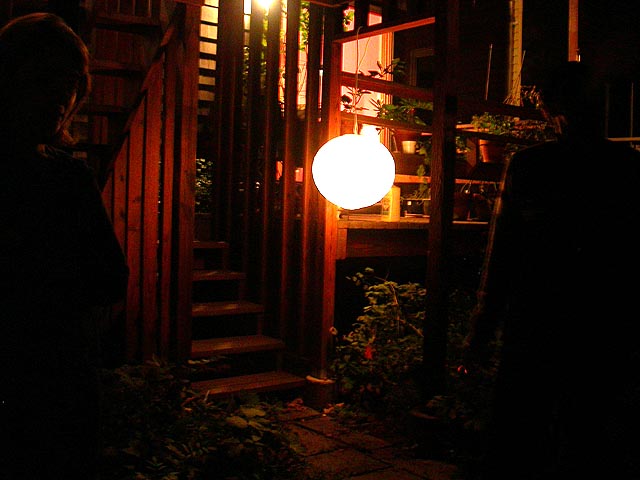 renata, scheduled to arrive at 7pm, called to ask if she could bring anything. "no, nothing," i replied. there was some awkward silence. "well, see you later," i said. "can i ask you one more thing?" said renata warily. she then quietly asked if she could do some laundry at my place, which i of course said yes (dirty laundry fascinates me). by that time rob had already came home. while i was making the appetizers and rolling the burger patties, rob was out in the backyard starting the fire in my new used weber grill. i snaked my chinese lantern from one of the deck beams so he could see better when it got dark.