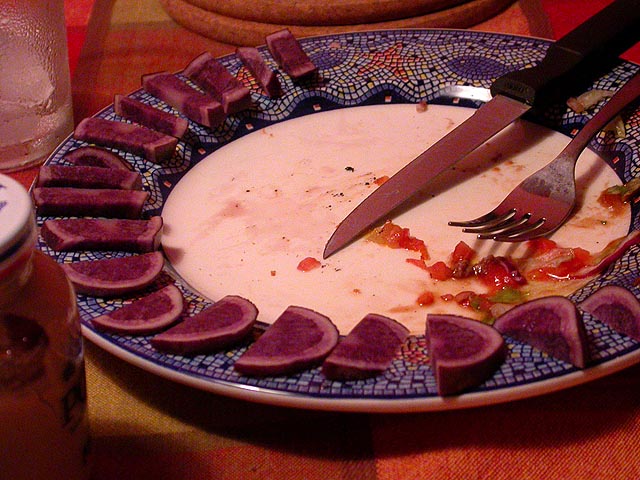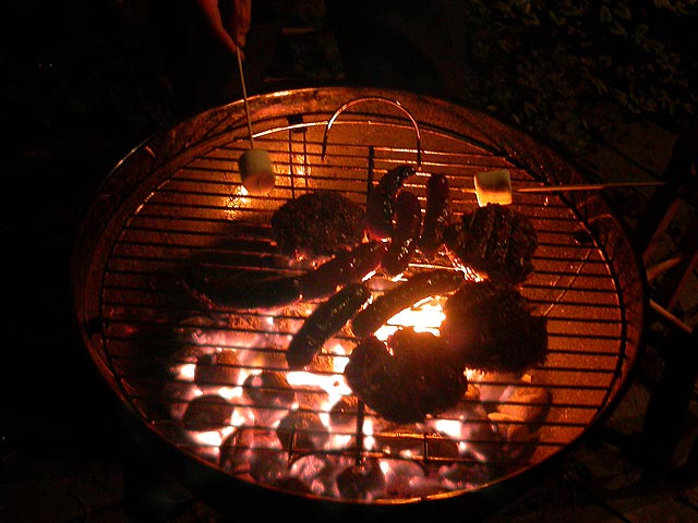 renata arrived with a pillowcase full of dirty clothes, as well as a bag full of purple potatoes and a pair of asian water pears. feeling cold, she asked if she could borrow some socks (looks like it's that time of year again when renata has a hard time thermoregulating her body temperature). by then the grill was ready for cooking and we all went outside, circling the warmth of the brickets glowing white hot. besides burgers, i also had chinese sausages, one of which suffered an early demise when it rolled off the grill and into the fiery abyss. the smell of barbecued chinese sausages remind me of taiwanese night life, street vendors hawking all sorts of meat served on a stick. while waiting for the food to cook, we also took the opportunity to roast some marshmellows, one per person. roasting over the controlled heat of brickets is a lot easier than the roaring flames of a campfire.