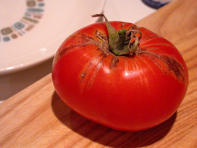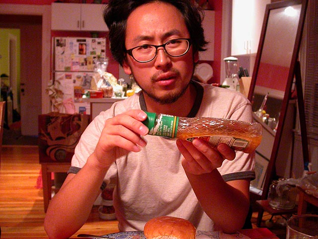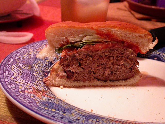 with the burgers and the sausages cooked, we went back inside. as this was a special occasion, i pulled one of my homegrown tomatoes and sliced it as part of the burger condiments. rob entertained us with childhood stories of being a ninja aficionado, a pyromaniac (his like-minded pyro friend almost set the entire forest of hanover ablaze), and an über-theatre geek (pippin, rob?). we also reminisced on one of my favorite topics, 80's culture, including music, television, and fashion. renata outed me as having dabbled in acid wash jeans, and rob revealed he once memorized the lyrics for "beat street." throughout the whole evening i only had to chase renata once when we tried to erase some "bad" photos i took of her.