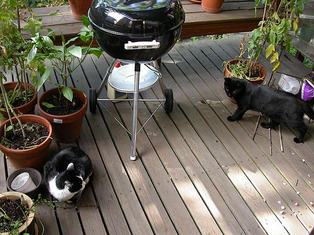 to burn into a hybrid cd that i would hand deliver via motorcycle to katrinka in boston. i hardly left my room, eating lunch (a toaster oven cooked french bread pizza) in front of the computer, never once turning on the television. occasionally i'd let the cat out or back inside. one time i saw she was all tense and looked across the deck to see a black cat sitting there. the black cat was friendly and curious, but rob's cat was all business, and eventually the black cat left, either out of boredom or the threatening purring of rob's cat.