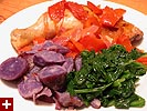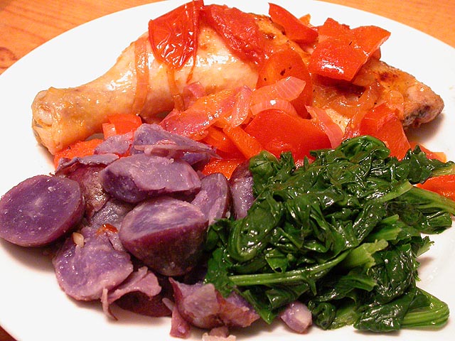 renata made a colorful dish, yellow drumsticks with red tomatoes and red peppers and white onions and purple potatoes and green spinach and magenta beet.