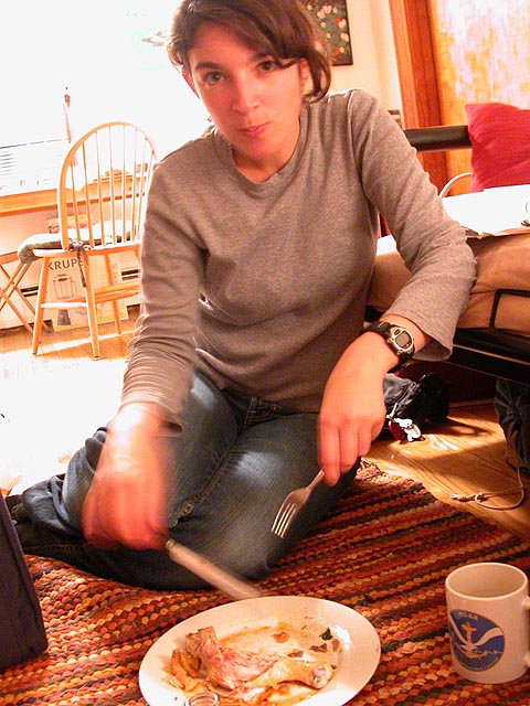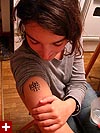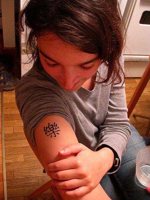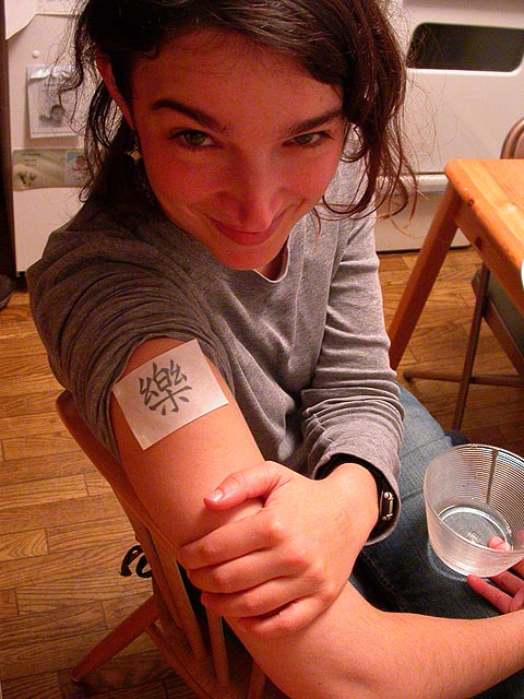 we both agreed that there's a lack of cooking based on not only taste but colors as well. for dessert, we chewed on some pomegranate seeds. i helped her put on a temporary chinese character tattoo that andrew gave her a while back that she's always kept but never used. we were deciding where to put it (i had some ideas): i suggested possibly stomach, renata proposed the small of her back, but we settled for the traditional arm location. i also helped renata write a chinese sign welcoming some exchange students before i left.