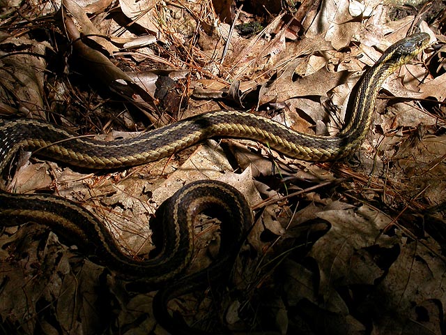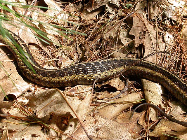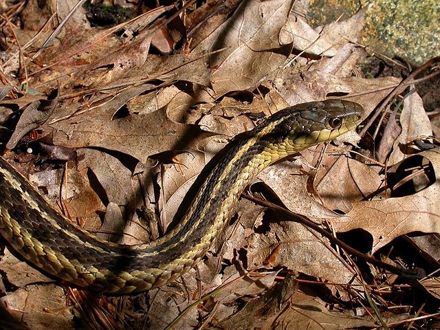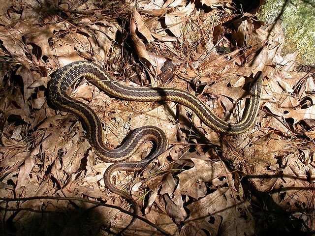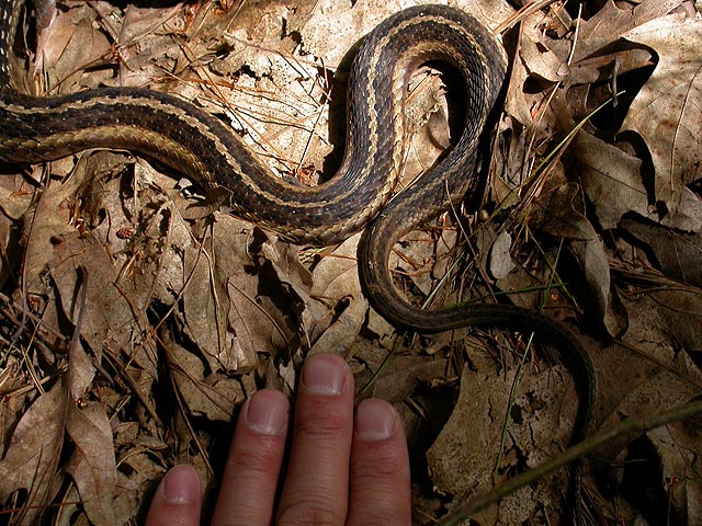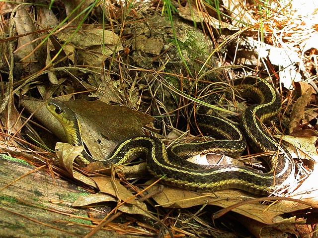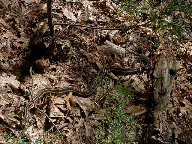 there was a second scenic vista, the eponymous rocky narrows overlook, further into the woods. i followed the trail but got slightly lost and went on a detour to the marsh edge of the river. i got a sense nobody had been down here because the trail was more overgrown with vegetation and occasionally i'd have to walk through cobwebs. it was here, walking down this path, that i got the crap scared out of me when a casual glance downwards to my left revealed not just one but several snakes sunning themselves on a sunlit spot on the forest floor. i immediately fell backwards and scrambled away in the opposite direction, as if out of instinct. from a safe distance i was able to survey the situation: one large garter snake, followed by a much smaller garter snake behind it. i started taking photos, inching closer and closer to the snakes. the larger snake wasn't moving, but the smaller snake lifted up its head and sniffed the air with its tongue. i've seen more snakes this season than i've ever seen in my entire life. they've mostly been garter snakes, with the exception of that one water snake i encountered in lunenburg. snakes both repulse and attract me. i admit, they scare me, but after the initial fear, i'm curiously drawn to them, they just seem so different, and a rarity (as least for me) to see them in the wild. the larger snake was a female from the obvious bulge in her midsection. the smaller snake i wasn't so sure, too large to be an offspring (where were its other siblings?), but seemingly too small to be her mate. i watched the snakes for a while, then slowly backed away and walked down the rest of the trail, making sure not to disturb them.