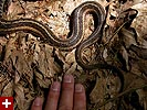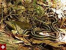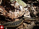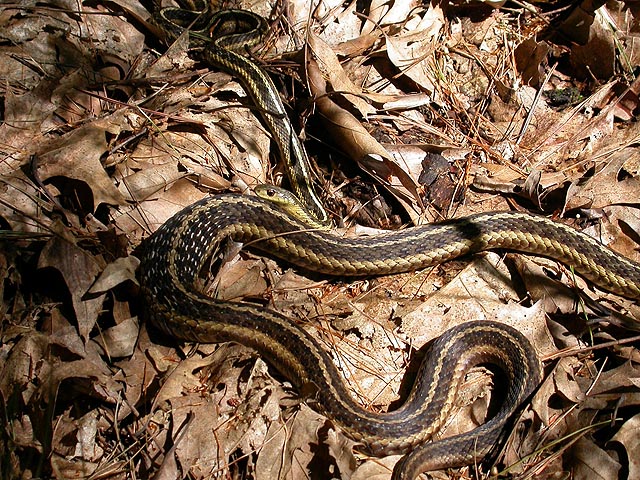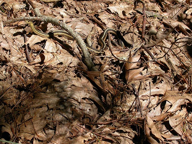 coming back up the trail, i slowed down as i approached the spot where the snakes were. i was disappointed when i saw they were gone, but then caught sight of them a few feet away from their original location. once again, the female was more still, while the "male" was more active, and even slithered towards me with flicking tongue to investigate. my movements seemed to make it nervous and it sort of slipped away amongst the leaf litter. the female was so still that i mustered enough courage to touch its tail end. it felt scaly and cold. my heart was beating fast as i slowly moved away again, having just touched a snake!