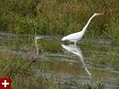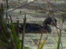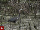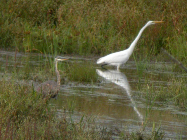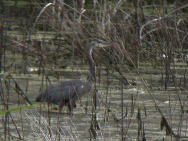 from this marsh vintage point i spotted a great egret feeding next to a great blue heron. apparently these two large birds can coexist peacefully. egrets and herons look downright prehistoric with their long snaking necks, i was sort of imagining that i was really looking at dinosaurs instead of birds. on the other side of the marsh i saw a small colorful duck swimming off in the distance. i had a hunch it might be a wood duck from my initial glimpse, and through the lens of my monocular i'm almost certain it was a wood duck, down to the red eyes. while looking at the duck, i caught sight of another blue heron standing in the marsh grass.