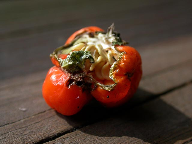 the perennial garden has been sort of neglected this season, neither my upstairs neighbor nor i taking very good care of it. the hydrangeas never flowered, and the place is starting to get overrunned with weeds. i took the opportunity to do some cleanup, collecting a bag of garden refuse. i totally forgot that i have turtlehead flowers growing in my own yard. i was also surprised to find that one squirrel damaged habanero pepper had turned from green to red even though it was no longer growing on the plant.
