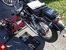 i woke up this morning, getting ready to go into the office, opening the blinds in the living room when i saw my motorcycle was lying on its side outside. i put on a shirt, kicked on my shoes, and ran outside to see what happened. it looked like it'd been thrown, half of it was on the sidewalk, half of it was on the street. i uprighted the bike and did a quick check to see what kind of damage. besides the scratches, the handlebar seemed to be slightly misaligned from the front wheel, the left rear blinker light looked crooked, and the kickstand was bent in an awkward position. as a matter of fact, the kickstand actually dragged on the street, leaving a deep scratch mark. even though the kickstand was contorted, if i teeter balanced the bike just right, i could get it to stand up precariously. i started up the engine and it sounded fine. after several more minutes of inspection, i went inside, found the number of the cambridge police, and called them. minutes later my father showed up, after i tried to call him earlier but didn't reach him. while we were outside looking at the damage, an officer driving a big police SUV arrived. a nice guy, really big hands, reminded me of puddy from seinfeld. i described how i found the bike. because there wasn't a lot of damage other than what happened during the drag and subsequent topple, the officer though maybe some drunk guys had some fun late last night. the fact that the license plate was also missing further boosted his theory. he was kind of surprised that it happened at all, and told me they don't get a lot of calls from my street, which is usually pretty quiet. just hearing him talk, it was obvious he's done some riding as well, and said he's seen my bike before, and gave me a bunch of advice on how i could fix the damage without going to a shop, which would cost me some money, and the insurance wouldn't even pay for it because of the deductible. he suggested that if possible, i should roll the bike into my backyard, for added security in the future. after he left, my father and i came up with our own theory as to what happened: somebody must've hit it while backing up (almost certainly a neighbor). the force of the impact pushed the bike onto the sidewalk, after dragging it several feet, which caused the kickstand to bend like that. as to the missing license plate though, that probably happened before the accident, and i just didn't notice it, the plate was already sort of ready to fall off anyway, and it was just a coincidence that i'm only now noticing that it's gone. it kind of sucks that i have no idea who did this, but that's the very nature of these hit and run accidents. i know i said i think maybe a neighbor did it, but i'm hoping i'm wrong, that i don't live next to people who would damage my ride without taking responsibility. who ever did this better hope i never find out, because i can be vindictive and cruel, plus with my newfound free time, who knows what kind of vengeful evil i'm capable of committing. it could definitely be worse, the bike could've been totally trashed, and it's one of those rare bike accidents where i don't suffer a single scratch (although it would allow me to find out who did it).