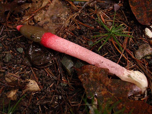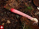i was completely alone. just me and some hungry mosquitoes, who kept away after my initial spray of repellent. the main trail was covered in gravel and sand and was wide enough to accommodate 2 lanes of car traffic. muddy puddles of varying sizes dotted the trail. right away i saw something interesting, a pair of elegant stinkhorns lying by the side of the road. at first i thought maybe they were discarded pens, but upon closer examination revealed they're actually mushrooms.