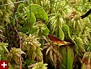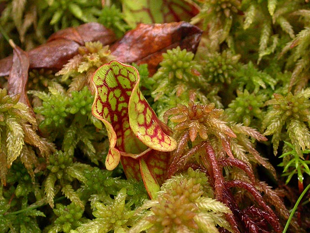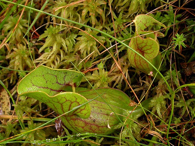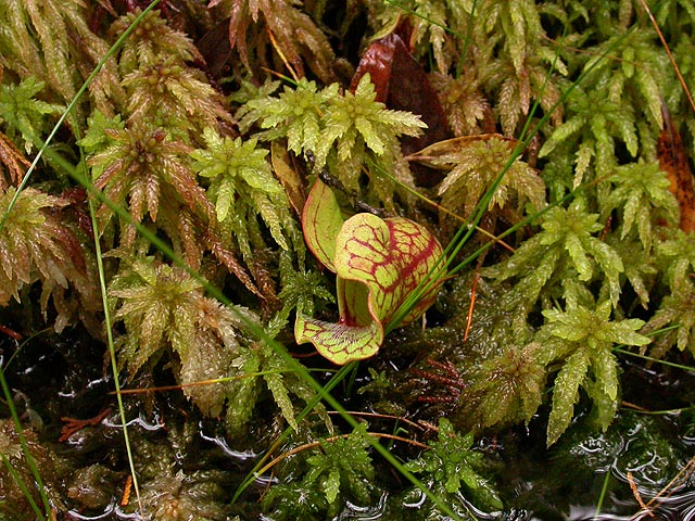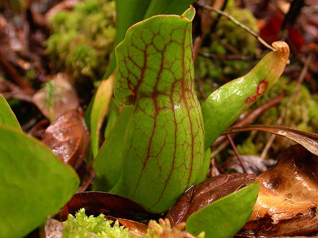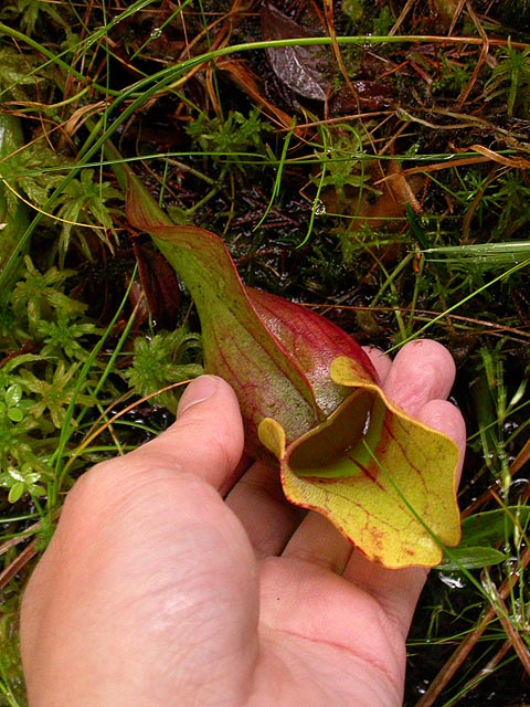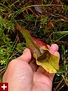 except there weren't any labrador tea. a little bit further up the trail, i came across some pitcher plants. it seems the deeper in get into this bog, the "healthier" the pitcher plants appear to be. the ones i saw early on were mostly green, but these that i was seeing now had very prominent red veins, just like the vermont pitcher plants. i took some photos, my butt on the boardwalk,
