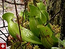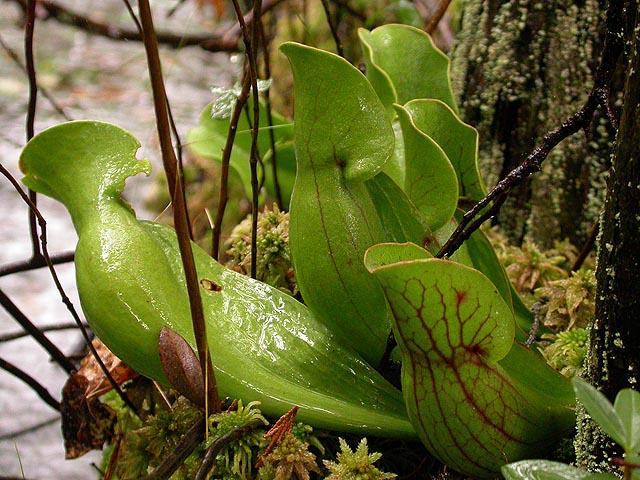 i was crouching down with one leg sticking out as balance, as the rain poured off the umbrella and onto my exposed back. i got up and took out the disposable poncho i had in my bag and put that thing on. while adjusting my new transparent waterproof jacket, i saw another really beautiful pitcher plant specimen nearby. since this was a little bit off of the boardwalk, it seemed like dry land, so i knelt down to take some photos.