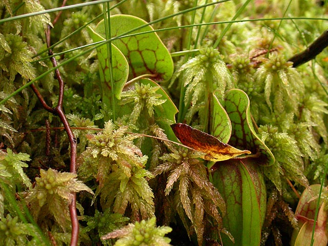 i noticed things going back that i didn't see when i was walking in. i saw many pitcher plants, seemingly more conspicuous now that i was leaving the bog and wouldn't be taking their photos. sometimes i saw them with sundews, a mixed community of carnivorous plants. i saw large red berries growing on top of the sphagnum moss that looked like cranberries. i wanted to take them home and eat them, but even if they were really cranberries, i don't know if i'd like the tart taste. and sometimes sphagnum moss, when they're completely submerged, appear to float on the surface of the water like balls.